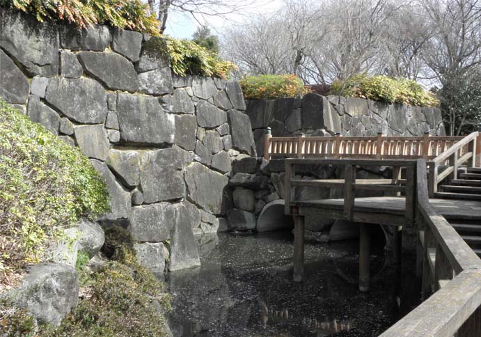 現在まで残っているのは、本丸跡だけといわれ、広大な城郭跡など宅地化で消えてしまっているらしい。どうやら写真の石垣、堀の構築は、公園化で築かれたようで、一般には喜ばれても、歴史家には、不評のようだ。