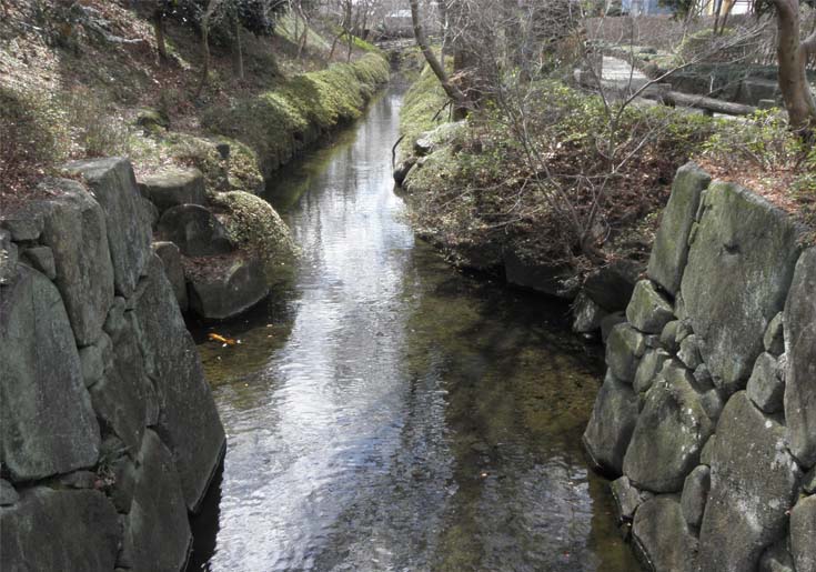 そんな中で、公園化した飛山城や勝山城を除いて、素人にも城を思い描くことができるような場所として、上三川城がある。上三川町の中心部にある公園にもなっていて、憩いの場所として訪れる人も多い。写真のように石垣、水の流れる堀に囲われていて景観もいい。