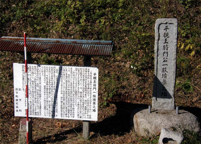 写真中: 「平親王将門一族墳墓之地」、石下大橋の右岸下堤防下に石碑と案内板。ここは、引手山と呼ばれ、父平良持の墳墓の地、将門が石井で戦死した時、豊田の郎党が遺骸を密かに運び、ここに葬ったといわれる。