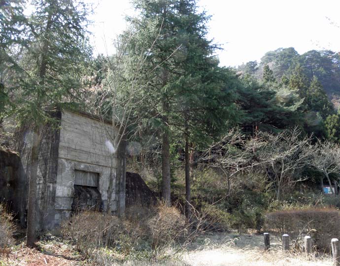 この南沢鉱山を探してみた。鬼怒川温泉を南に下り、東武ワールドスクウェアを過ぎ、左手、鬼怒川レジャー公園に出る。公園南端から入ると、「憩の森」の駐車場があり、東の奥に、写真中のコンクリートの建物跡、鉱石を運び出していたのだろうか。この建造物の裏側には、昔の水路跡だろうか溝筋が残る。また、「南沢鉱山跡」という道標も見つかったが、もう文字が消えかけている。憩の森は、小さな山にかけての遊歩道が設けられていて、山の上には、ベンチがあり、展望台から、下の鬼怒川や温泉街が眺められるようになっている。階段状の上り道の途中に、下の写真の坑口跡が見つかった。危険防止に閉鎖されている。