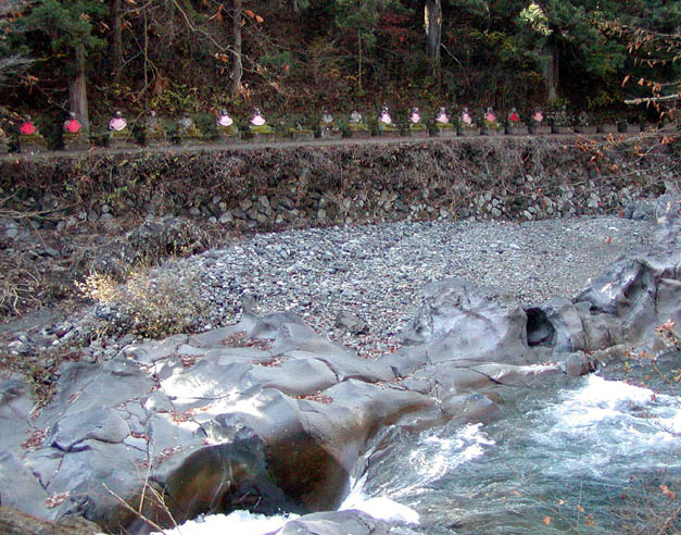 含満ヶ淵は、男体山から噴出した溶岩からなる奇勝で、巨岩の間をぬって大谷川が流れる。対岸は、東京大学理学部付属植物園日光分園、ここから眺めた並び地蔵が上の写真、地蔵が一列に並んで、奇岩の淵を眺めているのがよく見える。 |