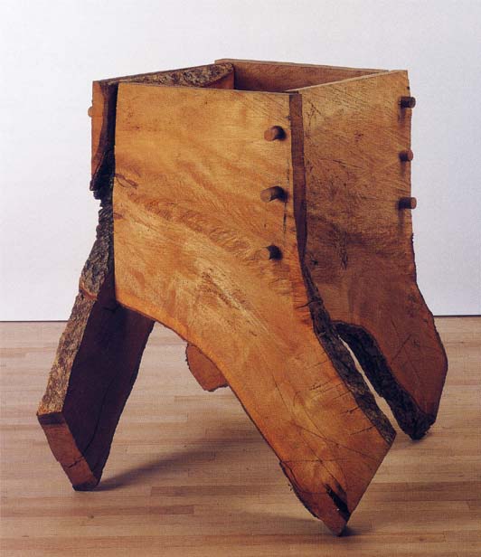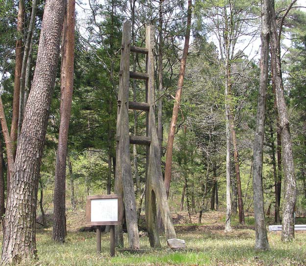 この「十二の旅」に彫刻作品を展示していたのは、デイヴィット・ナッシュ(1945-)。彫刻といっても、素材は樹木、それも倒木を使った。木の彫刻といえば、仏像のように細かな細工のが多いが、彼の彫刻では、素材の素質を活かし、あまり手を加えていない。1982年、奥日光の光徳に滞在して製作したミズナラの作品「捻箱」が、展示の一点で、上の写真。この「十二の旅」は、新装された栃木県立美術館の最初の展示だったが、改装される前、美術館の屋外展示広場に、ナッシュの「筧」という製品があったと記録している。今回この作品は展示から外れていたので、もう崩れてしまったのだろうか。自然の素材、時とともに変わって行くのも美術の一つの表現かもしれない。1984年、やはり光徳で製作したミズナラの「大梯子」が写真下。この作品は、日光の小倉山森林公園の中にある。静かな木立の中なので、公園を訪ねる人でも、つい見落とすかもしれない。日光市に寄贈されたものだが、ナッシュのメッセイジが添えられている。