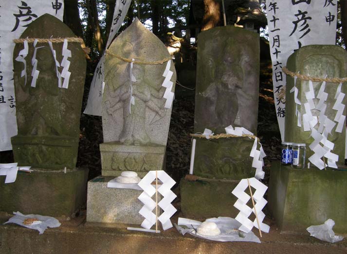 上三川町 上郷、日産自動車の東側、磯川緑地公園の北 愛宕神社古墳への参道の途中、猿田彦大明神が祀られている。古い庚申塔は元文5年(1740)、新しい庚申塔は平成8年。