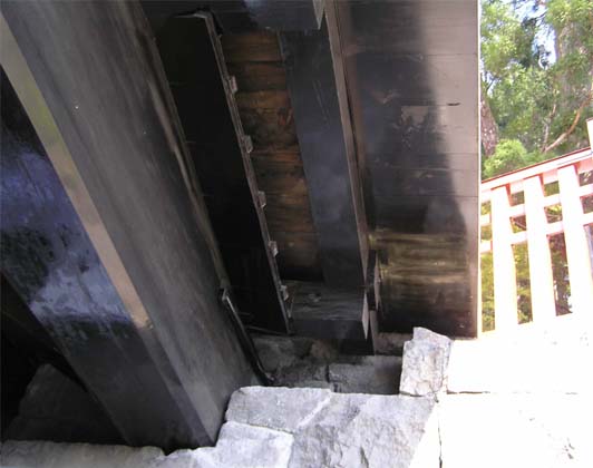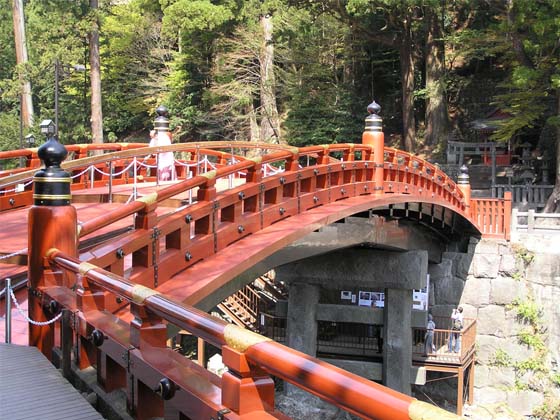 日光の表玄関、神橋が今年4月から、一般公開されている。平成9年から8年かかり、8億円投じた改修工事が終わり、平成17年3月竣功し、久しぶりにお目見えした朱塗りの橋がまぶしい。戦後2回(昭和31年、56年)に次ぐ修復になる。公開では、橋を渡って、見学用の階段を下り橋の裏側を下から眺められる。朱塗りの上部は檜材、橋げたの黒い下部はケヤキ、これだけの大きな木材はさすがに県内にはなく、他県から持ち込まれたとのこと。「乳の木」と呼ばれる橋桁の端を川岸の岩盤に4mも埋め込み、両対岸から片持ち梁工法で斜め上方に刎ね出し、真中で短い橋桁を上から載せ、台形円弧を形成する架構をとっている。両岸の橋桁は、鳥居の形の石製橋脚で支えられている。「はね橋」は、はね木を数段重ねて載せてゆく骨組みを持つが、この神橋では、一層一本の「乳の木」で持たせた独特の形状で、簡素化と美しさを強調している。