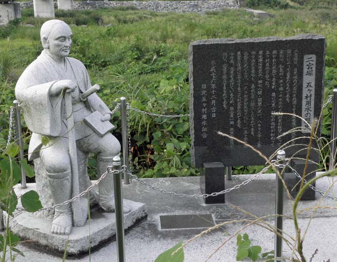 桜町にも尊徳像が残るが、日光地区の尊徳石像を二つあげる。上は、今市の報徳今市振興会館隣の報徳役所跡にある記念書庫と像、下は日光霧降大橋の下に、平成16年設立された記念碑と尊徳像、草の中に建つ。