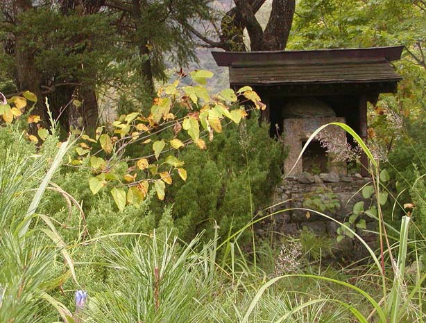 会津に通ずる男鹿川をたどって、五十里湖に向かうと、今は旧道になった海尻橋を渡り、布坂山を回り込んで五十里湖にでる。この布坂山には、以前五十里湖展望台があって、売店のある駐車場は、会津海道ドライブの格好の休憩所として賑わい、何回か利用させてもらった。いつの間にか閉鎖されて、入口は封鎖され、コンクリートの隙間から雑草がはびこっている。周りの草の中に、ひっそりと写真上の祠が今でも残る。高木六左衛門の墓の説明板もあった。