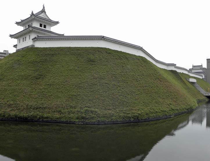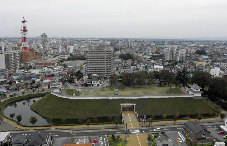 戊辰戦争での焼失、第二次大戦の空襲、戦後の市街地開拓と、城跡は埋め立てられてゆく。平成9年から、城の発掘調査、復元活動が続き、今、かっての城が姿を見せている。隣の市役所の16階展望窓からの眺めが写真上、写真下は高さ10mの土塁の上の清明台の櫓と奥の富士見櫓。