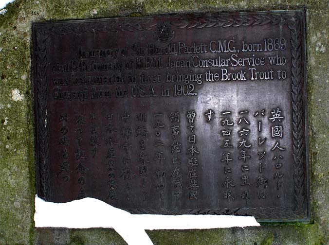この建屋の脇に、パーレット碑という石碑がある。「英国人ハロルド・パーレット卿は1869年に生まれ1945年に永眠す 曽て日本駐在英国領事館に在職中1902年初めて川鱒を米国より中禅寺湖に齎し日本水産業の発展に貢献す 依って記念の為此の碑を建つ」と読める。背面にも石に刻みがあるが、字が細くコケに埋もれ読めない。案内書によると、「到達せる鱒の卵は大島久治氏が献身的努力を以って孵化飼育 湯川に放流せるものにて パーレット卿の知人グラバー氏の指導による」と記されているとのこと。グラバーにやっとたどり着くことができた。碑は、昭和31年、息子のランジ・パーレットが来日して建てたという。パーレットだけの功績には不満だったのか、当時の所長が裏に追記を入れたのだといわれる。