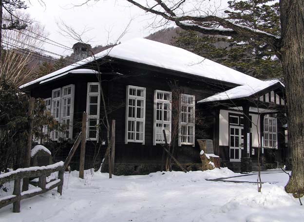1997年、トーマス・グラバーの伝記、「異人館」(白石一郎著、朝日新聞社)、「トーマス・グラバー伝」(アレキサンダー・マッケイ著、平岡緑訳、中央公論社)が、出版され、続けて読んでみた。当時、グラバーさんの名を日光で聞いたことがあり、どういう関わりだったのか疑問に思っていたので、探ってみようと思った。当て外れで、この二冊とも、日光の文字は出てこない。気になったまま、三冊目に読んだのが、「明治維新とイギリス商人」(杉山伸也著、岩波新書、1993)、やはり日光の記述は無い。ただ、”奥日光で大島久治とマス釣をするグラバー”という挿入写真が一枚だけあった。これを糸口に、あとは足で当たろうと、訪れたのが、菖蒲ガ浜にある水産庁養魚研究所日光支所、ミズナラの大木の下、養魚池や水槽に中禅寺湖のマスが泳いでいる。ここの案内書から、歴史を辿ると、明治時代、日光に琵琶湖や北海道根室から魚卵を導入、孵化したこと、官有地から戦後国有地に移り養魚発展してきたことがわかった。門から入って正面の歴史展示館(写真上)は、昭和11年、旧宮内省時代に、建築家レイモンドにより建てられた庁舎という。