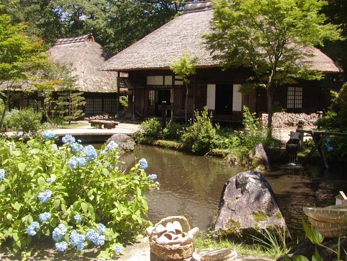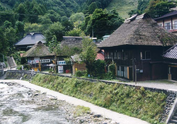 さて、町は近代化し、平家塚のほかに落人集落としての歴史に係る遺跡は残っているのだろうか。温泉が見つかるのが、1570年ごろのこと、湯殿山神社ができ、湯治場として人が訪ねてくるようになったのは江戸時代になってからのようだ。33観音堂というのがあるが、これも、33観音が各地で流行りだした江戸中期と思はれる。想像だが、落人達の世代まで遡ることができるのは、落人の眼を癒したという薬師堂(58. 薬師堂(9)平家部落)と落人達の菩提寺だったという慈光寺あたりだろうか。写真下は、平家部落と呼ばれている茅葺民家と奥の慈光寺。ただし、写真は古く、10年以上前に撮影したもの、最近は、家が新しくなり、平家部落の面影は薄れている。