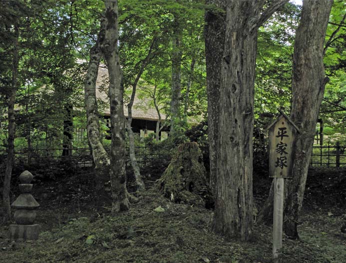 落人部落の雰囲気を味わうとすると、町の中心にできた「平家の里」を訪ねることになる。茅葺の館が並び(写真上)、歴史展示、民芸・生産物販売、伝統芸能の観光センターに人を集めている。この「平家の里」の隣に、「平家塚」がある(写真中)。暗い森の中で、注目されることもなさそう。湯西川に落ち着いた落人達は、武装を解き、甲冑・刀剣などをここに埋めたと伝えられる。また、忠房の墓ともいわれる。狭い場所でもあり、発掘は終わっているはず。財宝類は、南平山に埋めてきたのか、ここではあまり高価な財宝の話をよく聞かない。この「平家の里」のほか、「平家落人民俗資料館」、「湯西川歴史資料博物館」という施設もあり、この地の旧家に残されていた遺産、資料が展示されている。武具、衣類、古文書、生活用具といったものが中心、漆器が家宝であったことが感じられる。