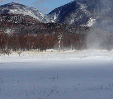 晴れた日を選んで、国道の竜頭の滝上から休止中のバスの道を歩いてみた。比較的この道は雪が浅い。時々雪掻きがされているようだ。小田代ヶ原まで3kmほど。でも雪の中なので1時間ほどかかる。途中、葉を落としたミズナラの林の中は風から護られていて、日が照っていれば暖かい。小田代ヶ原に出るととたんに強風に煽られる。小田代ヶ原は一面の雪野原。奥に、カラマツをバックに一本の白樺が立つ。「貴婦人」と呼ばれすっかり有名になり、春から秋にかけ、観光客と写真マニアが群がってくる。強風に舞う雪の吹きさらしの中で毅然として立っていて白い肌が美しく際だって見える。さすがに冬は人が少ないが、それでも何人かのカメラマンとクロスカントリ・スキーの人に出会った。