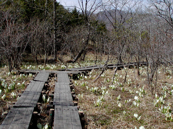 栗山村の鬼怒川の支流、土呂部川を車で遡って行くと、フィッシングセンタに遭遇する。その道路左側に面してこのミズバショウ自生地が広がる。それほど広くはないけれど、木の歩道に沿って、花の集落を見て回ることが出きる。昨年は、開花後霜が降り茶色に変色してしまっていたけれど、今年は、4月から純白のミズバショウが一面に広がっている。