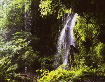 日光街道120号線の清滝、裏見ノ滝入り口案内板から荒沢川に沿って、車が入る。奥に裏見滝駐車場があり、ここで一般車は通行止め。ここから川沿いに歩いて、ほぼ1キロ位だろうか。ハイキングには短い山歩き。本流を中心にいく筋かの小さな滝も左右にあり、滝のそばではしぶきを浴びる。本流の岩盤の裏には窪みがあり、ここに不動明王が祭られ、参拝しながら裏からの滝が見られた。滝水のすだれの中で涼を楽しむことができたのに、今は、岩盤が崩れて裏に回るのが危険になり、立ち入り禁止になってしまった。上の写真はやっと入ることができた何年か前のもの。結構しぶきを浴びて濡れながら撮った。