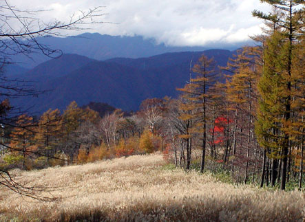 紅葉の時期、鶏頂山と釈迦が岳に登って見た。上の写真は登り始めの鶏頂山スキー場のススキのスロープ。