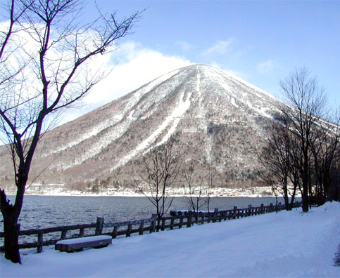 男体山は、表道になる二荒山神社の登拝門が5月にならないと開かない。開山は5ヶ月だけ。山登りのことはまた別に取り上げよう。冬の間は観光客をずっと減り、中善寺湖畔は人影が少ない。ここ何年かかけて工事が行われた湖畔の国道沿いは見違えるほど明るくきれいになった。特に湖畔側の建物や桟橋は新たに建て替えられて観光客に好感が持たれるようになった。冬は雪の中だけれど、写真を撮りながら歩くのも悪くはない。写真は立木観音のある中善寺の前、歌が浜の駐車場からの男体山。