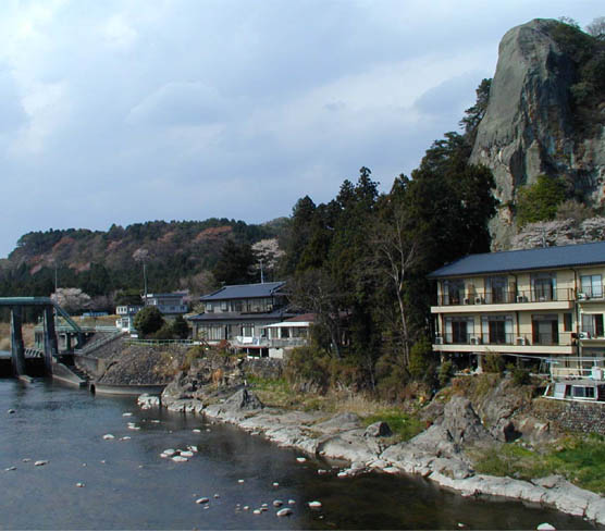 塩谷町の鬼怒川左岸に、古くからの桜の名所がある。今でも宴を張る人たちが桜の季節集まってくるようだが、古い時代はかなり賑わったことだろうと思う。川沿いに料理屋の軒が並ぶ。桜に囲まれてそそり立つのは64mの高さのある大岩塊。岩面に大日如来の坐像が彫られている。佐貫観音とも呼ばれ、像の総高18.2m、顔面の長さ3m、肩幅9m。8葉の連座の上に座す。彫りが浅いので最初はよく見えない。目を凝らしていると姿を現してくる。長い年月で削られていったというより、もともとの線彫りだったと思われる。何時彫られたかは不明のようだが、平安末から鎌倉初期のものといわれ、弘法大師一夜の作とも伝えられる。岩の上部には、奥の院大悲窟があり、中には貴重な宝物が納められているという。国の重要文化財指定。岩の頭には、亀の子岩が乗っていて、自然のものか人工的に乗せられたのか珍しい形をとっている。