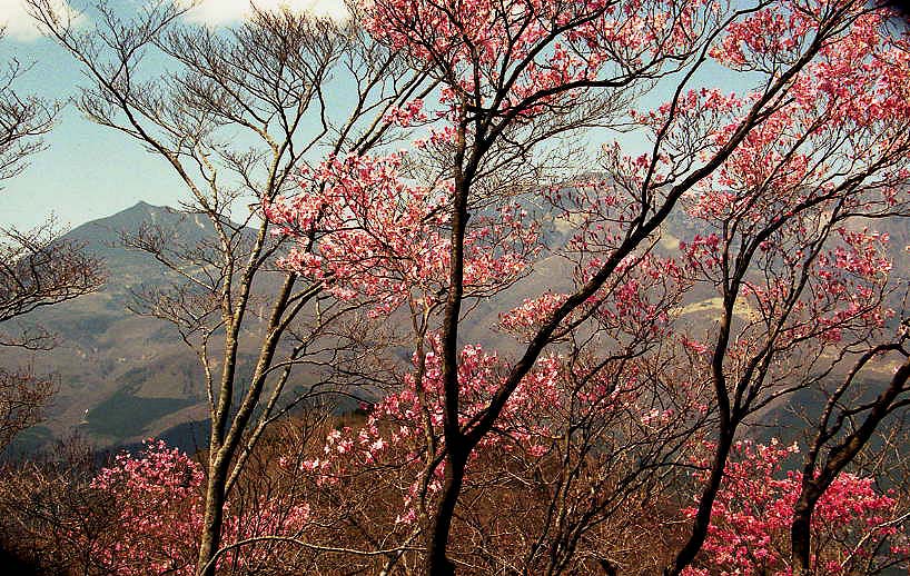 ガイドブックには、JRや東武の日光駅から国道を抜けて、日光公民館のところから鳴虫山登山口にとりかかると書かれていて、こちらからが一般ルートになっているが、逆のルートを通って見た。神橋の上流、含満ガ淵を遡って、発電所の先から登山口にはいる。新緑の山道を登って、ピークの独標、その先の展望のよい合方と続く。足元にはカタクリが群れ、目の先にはヤシオツツジが続き快適なトレッキングルートなのだが、徐々に登りがきつくなる。頂上に近づくにつれ急登で足がすべる。ガイドブックに逆らったからか、降りてくる登山者を何度も避けなければいけなくなる。でも雨の後などこの滑りやすい坂は降りるより登りのほうが楽ではないだろうか。頂上は、休憩台ができていて、上の写真のようにヤシオツツジの間から日光の山々が展望できる。