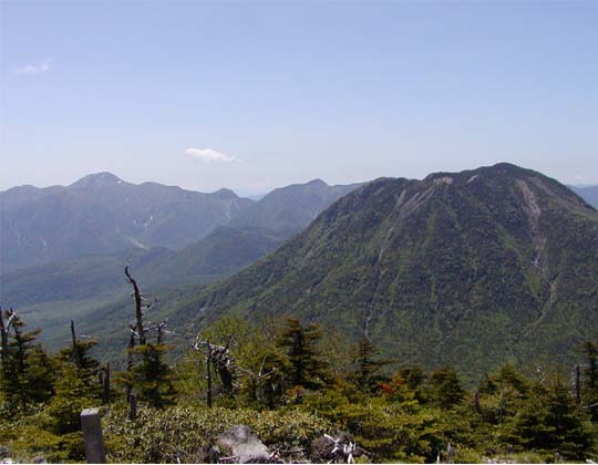 男体山と女峰山の間に二つのピークがある。大真名子山(2375m)、小真名子山(2323m)と呼ばれ、奥に退いた太郎山と合わせ、一男二女の子供を持つ家族を構成している。この山に登るには、男体山を回りこんで裏側にアプローチしなければならない。それだけ日光の山の中でも深山の趣が残っていて、登山者も少ない。大真名子山の山頂には、座王権現の銅像が建っていて、御嶽山信仰の山として知られる。上の写真は、小田代が原から見た大真名子山と小真名子山。下の写真は、小真名子山頂上下からみた太郎山(右)と奥日光・白根山方向。日光の山々の眺望が楽しめる。