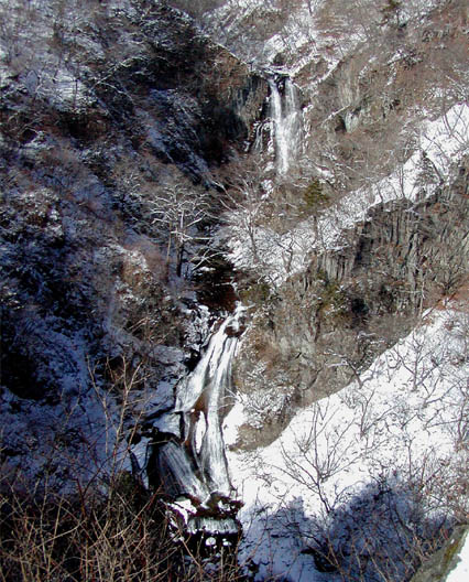 日光三名瀑として、華厳の滝、裏見の滝と並んで観光地になっている。霧降川にかかる上下二段の滝で、上段が25m、下段が26m、高さ75mになる。下段の滝の水が、霧を降らせるように岩に当たり流れ落ちるところから名づけられたという。滝を眺めるのにはここからしかないと思える観瀑台は、霧降高原有料道路ゲート前から入ったところにあり、正面から眺められる滝の景色は息を呑む感じ。春の新緑とヤシオツツジ、夏の涼感、秋の紅葉と四季それぞれいつ来ても楽しめる。その中でも、冬がいい。滝の回りの木の葉が落ち、滝の全貌が一番よく見通せる。雪があると白い衣装をまとって輝いて見える。