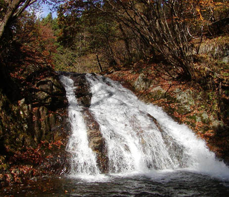 霧降の滝ハイキングコースというルートが、今市市瀬尾にある「今市少年自然の家」の活動テーマにあげられていて、この場所から霧降川に沿って遡り、途中から霧降川から離れ林の中を抜けて観瀑台に至る2時間のコースがある。紅葉の中を渓流に沿って歩くと、途中床滑という平らな岩の上を広がって水が流れる景勝地などあり、比較的流れが緩やかな渓谷歩きができる。「滝頭の滝」(写真下)という表示が出ている先から林に入る。途中に「長峰ヶ丘」という平坦なところもあるが、展望はない。林が続く。春には、アズマイチゲの白い花が見られた。上りきったところが観瀑台への歩道のところ。滝頭の滝からまだ霧降川の上流に向かい林道が延びている。林道を辿ると霧降川を滝の沢橋を渡り、前日光牧場に至る。この橋のところから霧降の滝の滝壷には入れないだろうかと細い踏み跡を辿ってみた。まもなく無名の滝に出会った。そこから踏み跡は徐々に見分けられなくなり、絶壁に遭遇して諦めた。深い淵、絶壁の両岸、川を遡るのは不可能とみた。