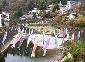 年々減少する観光客を呼び戻そうと温泉地はどこもレジャースポットを設置したり、イベント企画をしたりと結構苦労をしているようだ。この川治温泉では、5月の連休を当てこんで鬼怒川と男鹿川を跨いで鯉のぼりを渡す。何十匹という鯉が新緑と温泉宿の間を泳ぐのは壮観だ。下を流れる清流に映って鯉が川を泳いでるようにも見える。