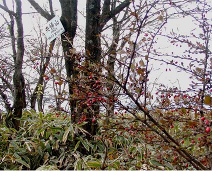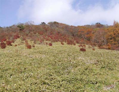 栗山村日陰部落から、日陰牧場への道へ車で入る。林を抜けると開かれた牧場へ出る。ゲートを開けて入り込んだ牧場は牛が草を食んでいる牧草地が暫く続く。熊が出ると聞いたが、この日は見かけなかった。牧草地の最高点のゲートを出てすぐ、夫婦山の登山口があるが、分かりにくい。ここに車が止められる。ここから見上げた夫婦山への登りは、ささやまとヤマツツジ、その上の広葉樹林が続く。最初はささやまの隣のカラマツ林の中を行く、牧場の有刺鉄線に沿って登る感じ。ささはら、ヤマツツジ、低めの広葉樹林へ入り、クマザザが深くなり、笹から頭だけ出して歩くようになる。足元が見えないので、石や根に躓かないよう注意が要る。針葉樹が混じるようになり、尾根に出る、ここから左に曲がり、山の上に出た辺りを少し右に回りこんで頂上に出る。頂上は比較的平で、やはり笹原、見透視はよくないが、少し位置をずらせば、展望が開ける。東の眼下の栗山ダム、その向こうの月山、南の牧場から、先の霧降高原、女峰山と山が連なる。登山口から1時間ほどの行程、笹に苦しめられるが、秋の紅葉がたっぷり満喫できる。上の写真の登り始めのササとヤマツツジのコントラスト、下の写真の頂上のメギの赤い実、途中のイロハカエデ、ハウチワカエデ、イタヤカエデ、ウリハダカエデなど赤や黄色の彩り、足元のリンドウの青と歩くのに飽きが来ない。下りは大岩という岩を回り下るルートがあるとガイドに記されているが、同じ道をモミジに釣られて下った。