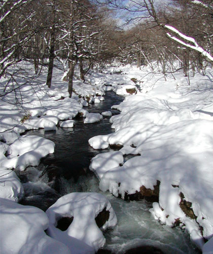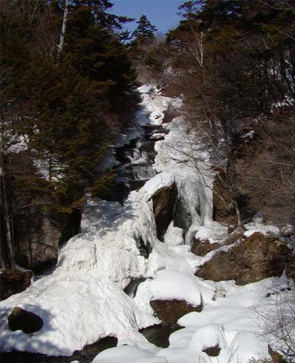 湯ノ湖から流れ出た湯川は、戦場ヶ原を迂回して、ミズナラとその下のミヤコササの森を抜けた後、一気に竜頭の滝となって中禅寺湖に向け下る。滝を下った後、左からの地獄沢と合流、中禅寺湖に注ぐときには、地獄川と名前が変わる。男体山噴火で噴出した溶岩でできている急流の上を、200m余りを流れ落ちている。滝の下には、茶屋があって、裏の観瀑台のところから眺められる滝の二分化したところを竜のひげと見立てたところから、命名されたともいわれる。茶屋から上流の国道の橋までが、一番観光で賑わう。春のトウゴクミツバツツジが咲くころと秋のモミジのシーズンは人がごったがえす。冬、雪に覆われた滝周辺は、歩きにくいけれど、私の一番気に入りの景色になる。歩く人もほとんどいない。溶岩の上を流れているので、岩がもろく、ところどころ、侵食で作られた甌穴が見られる。冬の澄み切った青い水が、白い雪とのコントラストで目が覚めるように美しい。竜頭橋の国道の上から、戦場ヶ原に抜ける歩道があり、歩道に沿っての湯川は、狭い岩の間を流れ、岩からほとばしり、広くなったところでは瀬の流れを見せ、歩きが楽しい。