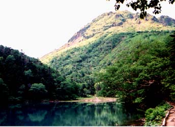 国道120号の菅沼駐車場:バス停から枯沢にそって林の道を登る。針葉樹林が多く、ヤグルマソウやカニコウモリなど日陰の植物が目立つ。2時間ほどの登りで開けた前方に弥陀ヶ池(上の写真)。シラネアオイが有名だが花は七月には終わっていて見られない。これからマルハダケブキ、コバイケイソウの時期になる。池を回ってここからダケカンバの中、そしてハクサンシャクナゲの白い花を潜りながらだんだん登りが急になる。浮石の多い岩場できついが、後ろ側には弥陀ヶ池、座禅山、その向こうに菅沼や丸沼が見下ろせる。岩を這い上がって、池から1時間半ぐらいで奥白根山頂。関東最高峰だけあって山頂からの眺めは最高。山頂を越えて先には火山口跡のなだらかな場所があり、ここからつづら折の滑りやすい浮石の道を下る。ダケカンバの林を歩いて避難小屋を経由、下ったところで五色沼に出る。ここから見る奥白根山は岩の突起が独特な景観を作っていて、きれいな水をたたえた沼と併せ気分爽快な休憩所になる。ハクサンフウロの花が咲いているが、草の丈が皆小さい。鹿に食べられ伸びられないようだ。ここから急な登りを越えて30分ほどで弥陀ヶ池に戻れるが、途中で五色山への分岐があり、五色山から湯元へ下ることもできる。